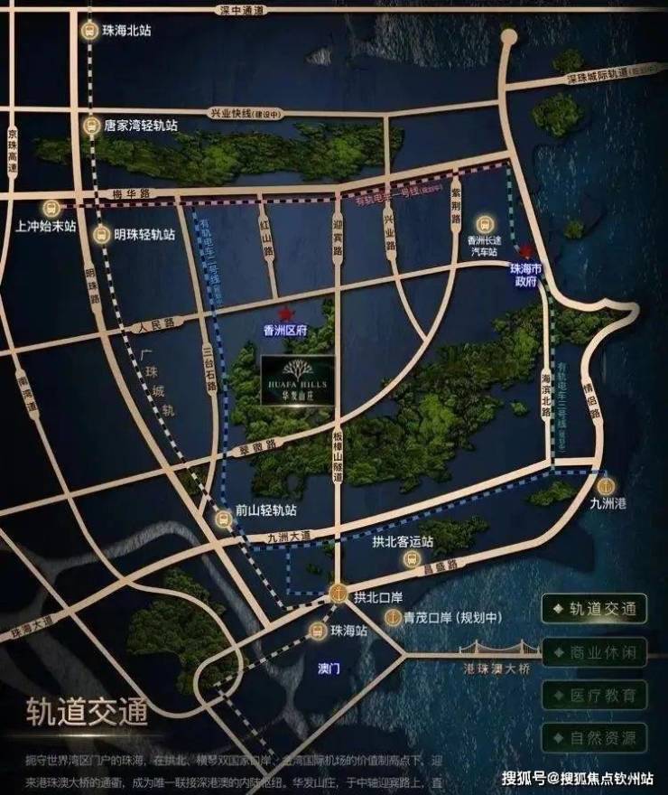 交通方面:离澳门最近的别墅区,4.5KM直达拱北口岸,空、港、轨皆掌握时间的优先权,接驳生活新万象;青茂口岸约4.7KM、港珠澳大桥口岸约6.2KM;九州港约4.5KM、九州机场约4.6KM;珠海高铁站约4.7KM