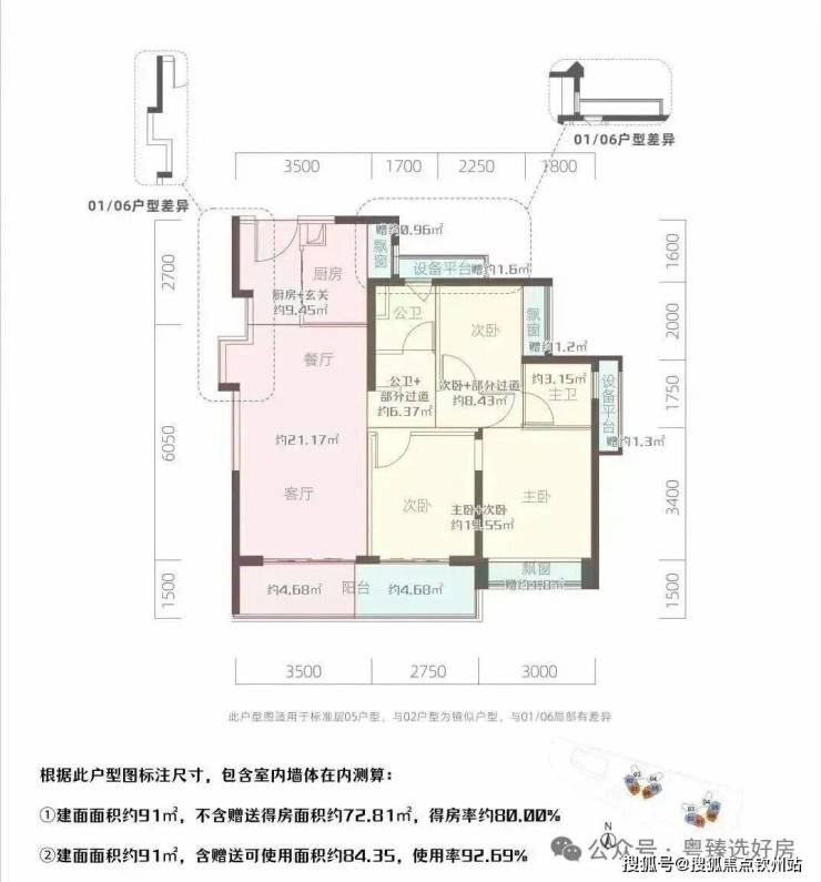 81㎡的3房2厅2卫,设计的是竖厅南北通透格局,客厅3.4米开间,3个卧室分别是3米/2.6米/2.2米的宽度,L型厨房,得房率:94.35%(包含赠送),阳台西北或东北朝向。