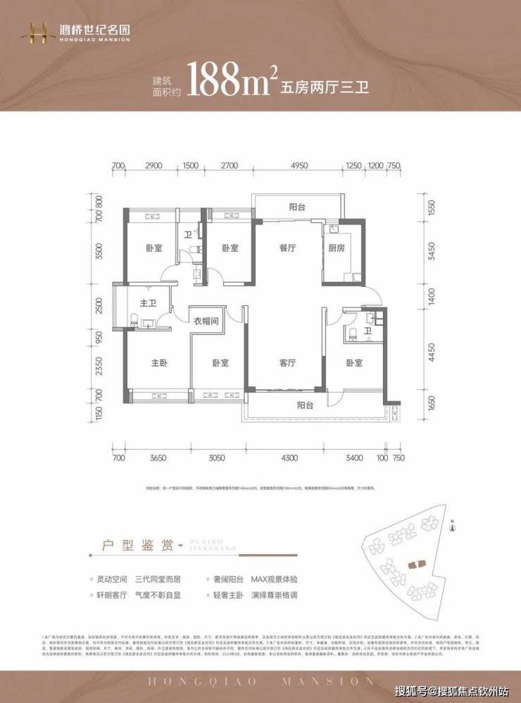 188㎡的5房2厅3卫,设计的是竖格局,南北通透双阳台,客厅4.3米开间,LDKB一体化设计,双主卧套间设计,5个卧室分别做到了3.65米/3.4米/3.05米/2.9米/2.7米的宽度,L型厨房带1个小生活阳台,公卫三段式分离,客厅阳台连接次卧出7.7米长的大阳台,主朝正南向。