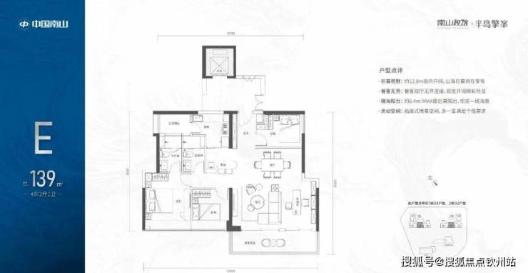 【139㎡的4房2厅2卫】1栋03/2栋02高区户型,电梯入户送独立公区,竖厅类双龙抱珠格局,四开间朝南,主卧大套间设计,有1个多功能间可以做书房,6.4米长观景大阳台,L型厨房带1个生活阳台,卫生间干湿分离,得房率:72.07%(不含赠送),西南朝向;