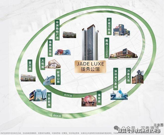 约3-5KM范围内:聚集南山前海山姆、云城万科里、万象前海、万象天地、海岸城、深圳湾万象城等高端及旗舰商业;以及宝中海雅缤纷城、大悦城、中洲购物广场等潮流商业MALL;