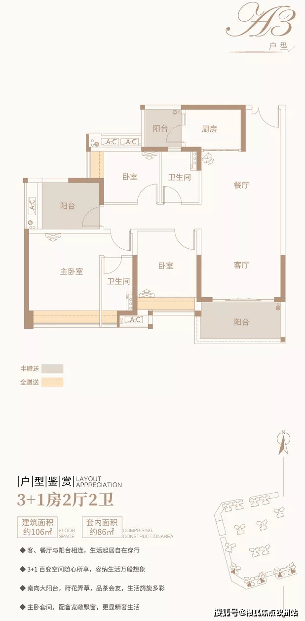 【户型鉴赏】3+1房2厅2卫/约103平方米/南北对流双阳台