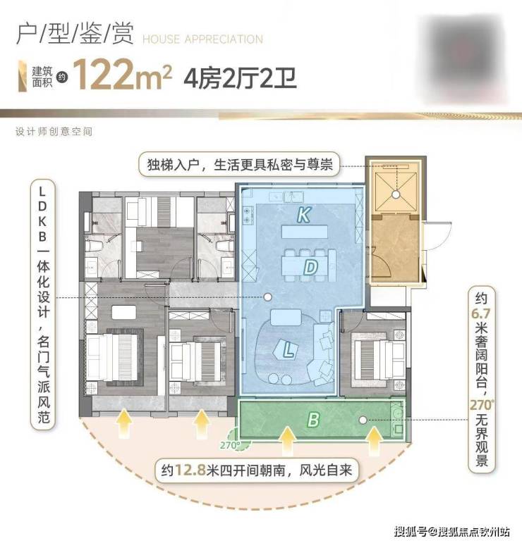 约122㎡户型在四开间朝南的基础上,将南向面宽延展约12.8m,让全屋采光最大化,远超同面积段户型。