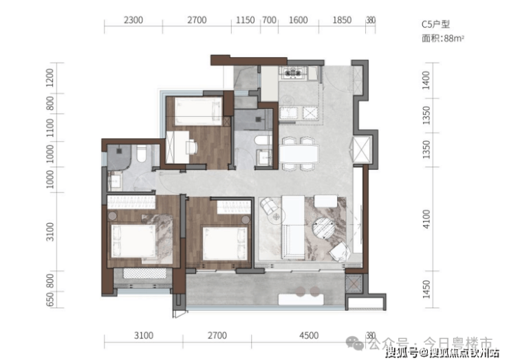 建面约88㎡三房两卫户型,纯南向采光设计,主卧套房科学分区,空间实用,适配有为青年群体。