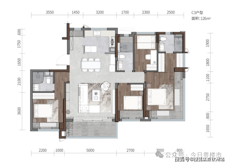 建面约126㎡四房三卫户型,视野通透,拥有私家电梯入户、双套房等奢华设计。