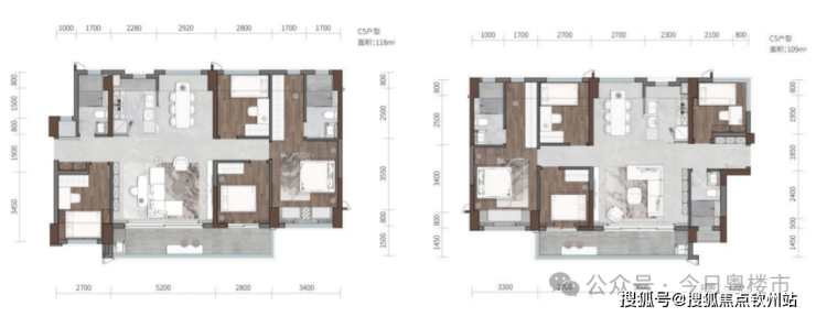 建面约109/118㎡四房两卫户型,经典南北对流格局,升级配置豪华独立衣帽间,功能实用性进一步提升。