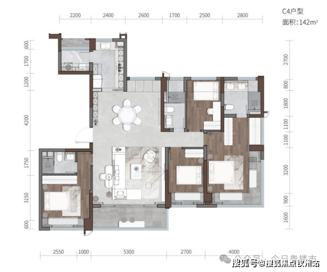 建面约142㎡四房三卫户型,拥有双套房,享独立中西双厨房、南北双景观阳台等设计,彰显高端居住品质。