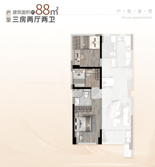 建面约84㎡三房,则是帮你将家庭打理得井井有条的生活管家。
