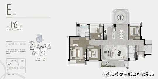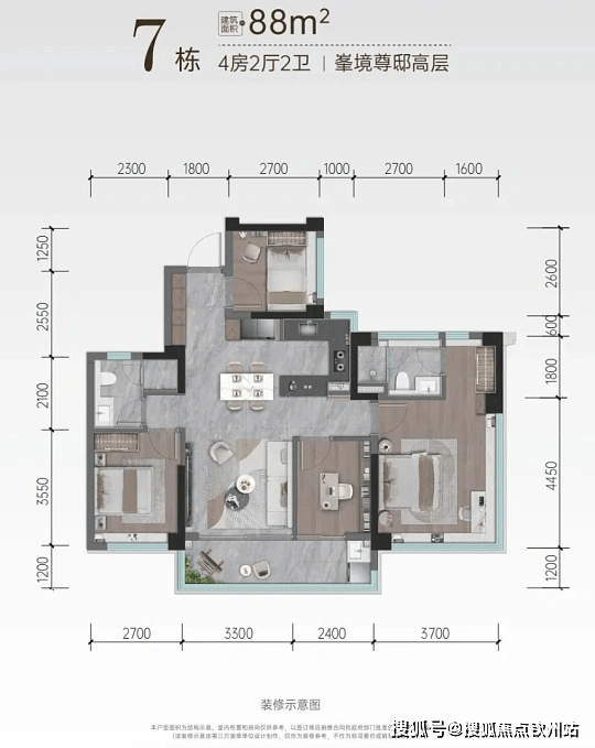 户型:88-142㎡三至四房高层,240㎡270° 环幕空中墅院,层高 3.2 米,户户带超大露台,得房率超 100%。