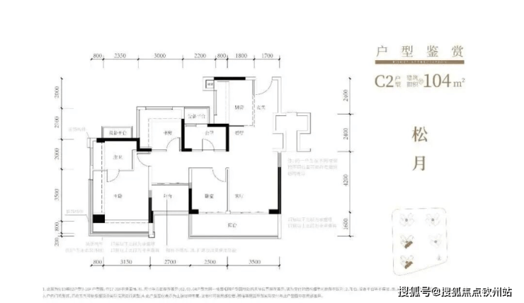 104㎡的4房2厅2卫,C1-C2户型,设计的是经典竖厅格局,进门入户玄关,客厅3.5米开间,LDKB一体化,S墙设计预留冰箱卡槽位,动静分区,四开间朝南,分别做到了主卧17.98㎡/次卧8.37㎡/次卧8.1m²/次卧7.75㎡(包含墙体飘窗),L型厨房,公卫干湿分离带1个约2m²的设备平台,得房率约79.2%(不含赠送),客厅连接次卧出9.6m²的观景大阳台,东南或西南朝向。套内面积82.58m²+赠送面积23.86m²=实用面积106.44m²,加上赠送后得房率约102.04%。