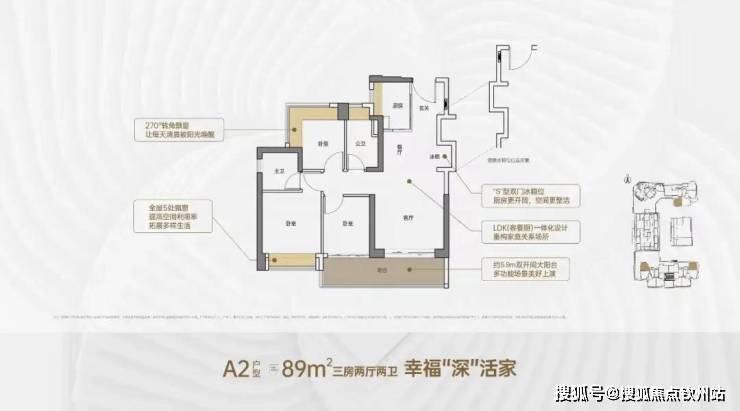 89平3房两厅两卫,设计的是竖厅格局,客厅3.5米开间,阳台有朝西向、东向、南向。