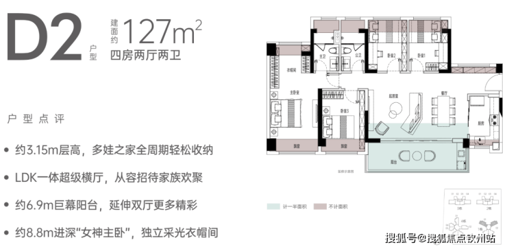 一、1栋01、02户型127㎡四房两卫【东南向河景】::106%使用率,大四房6.9米大阳台;