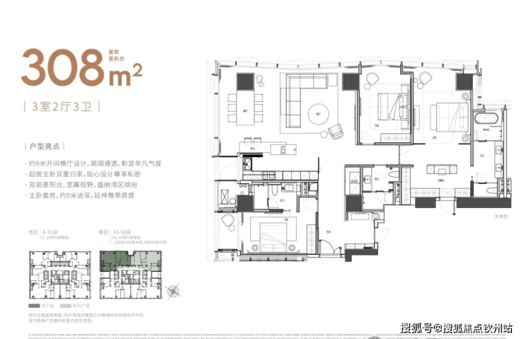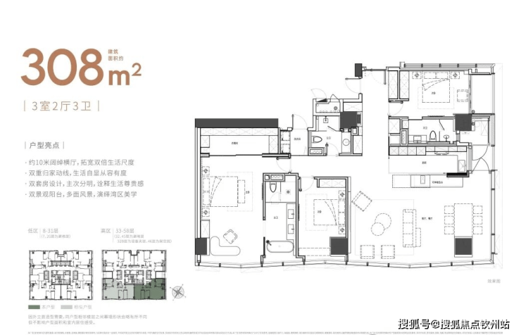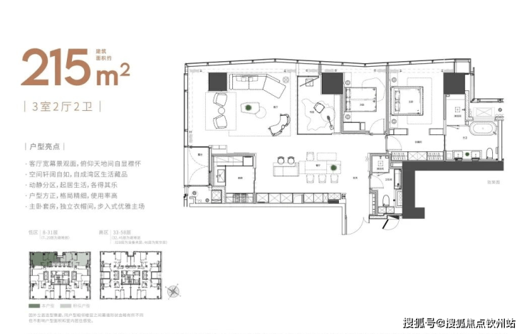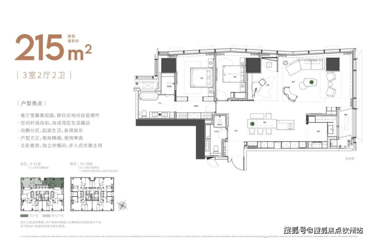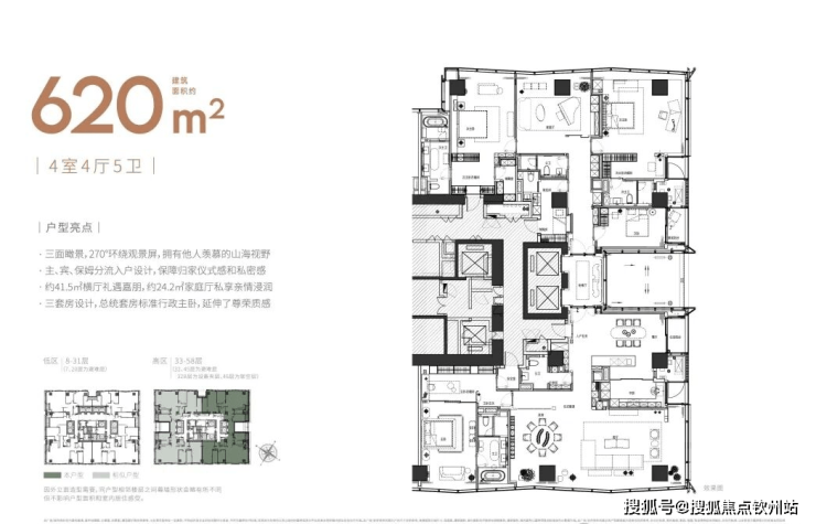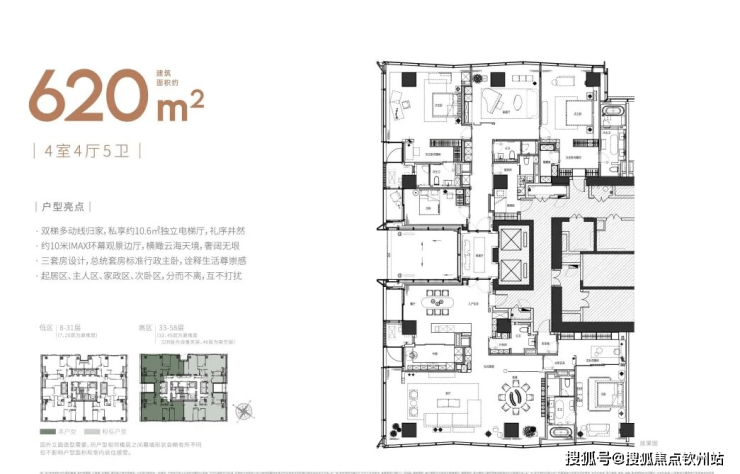 大平面大尺度定位,层高约3.6米,横厅设计确保奢阔观景面,全户型纵享环幕视野。项目打造建面约215-620㎡纯粹品质公寓,顶层为建面约1270㎡公寓产品。