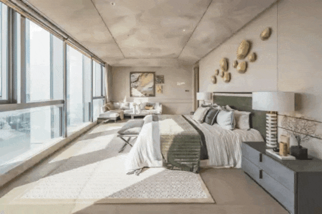 在空间的整体规划上,解放了厨房的空间,打开了整个空间布局,扩大空间视觉感受。超9米巨幕落地窗配以3.6米的奢阔层高,270度俯瞰双城盛景,视觉突破传统的禁锢,向外无限延展。