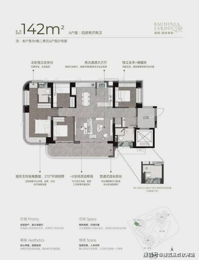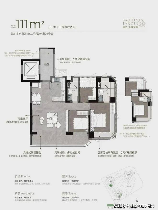 小区有485套纯住宅,车位595个,容积率5.14,共有三栋住宅,每栋做了36-37F高的4梯5户设计,每户都有专梯入户空间。