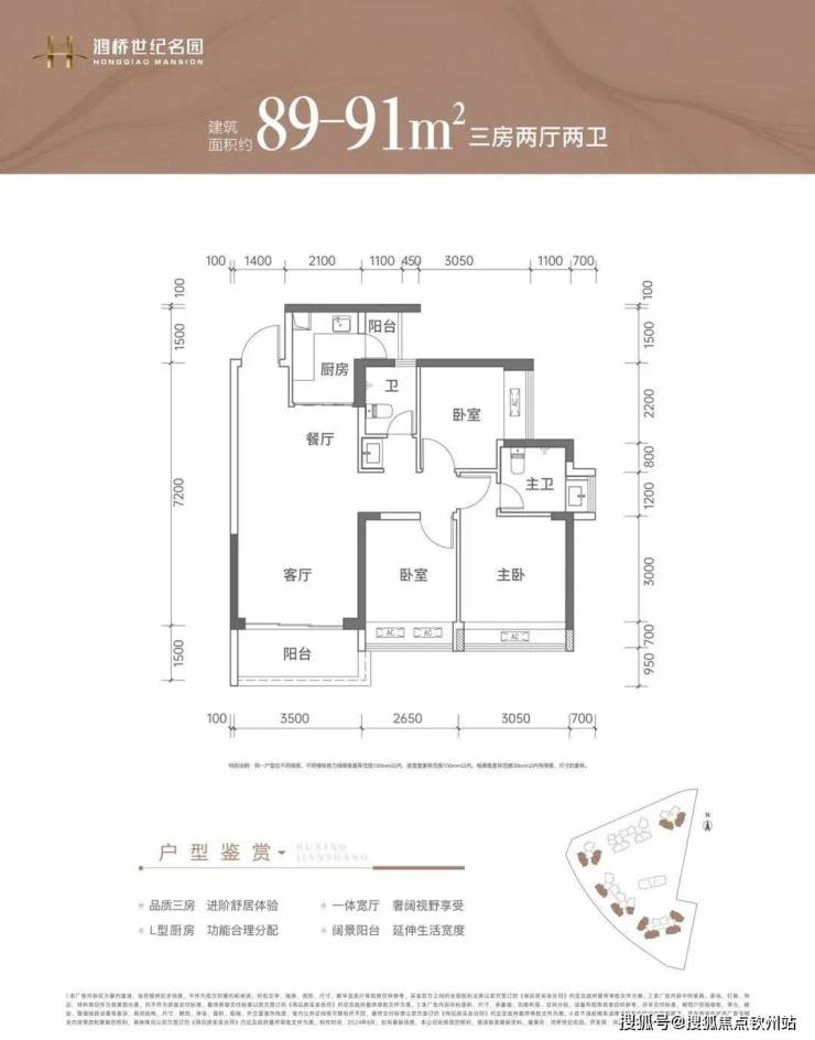91㎡的3房2厅2卫:竖厅南北通透格局,客厅3.5米开间,LDKB一体化设计,3个卧室分别做到了3.05米/2.6米/2.55米的宽度,L型厨房带1个小生活阳台,卫生间干湿分离,阳台主朝正北向。