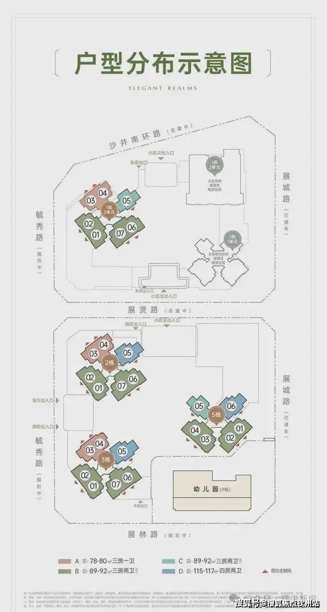 2、3、5栋为纯住宅,总高31-32层,4栋为1所4层2970㎡幼儿园,容积率4.3。