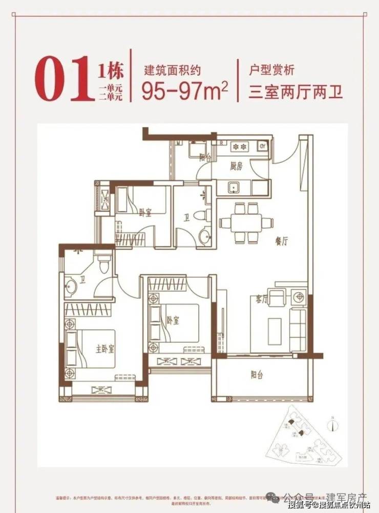 约95-97㎡三房:南向端头位,三面采光,花园瞰景。