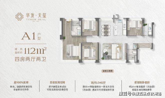 约110㎡四房两厅两卫:约16米通风面,户户是端户;约28㎡行政级端卧套房,270°景观视野,360°环统式采光