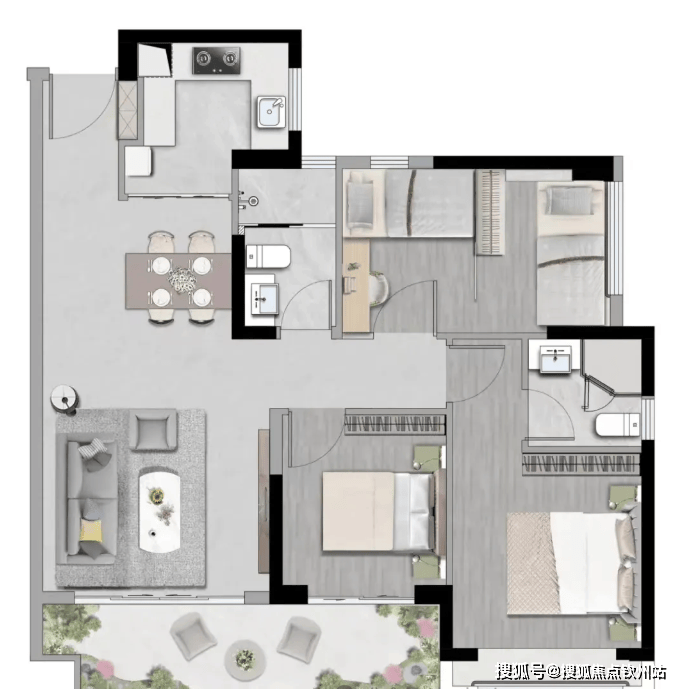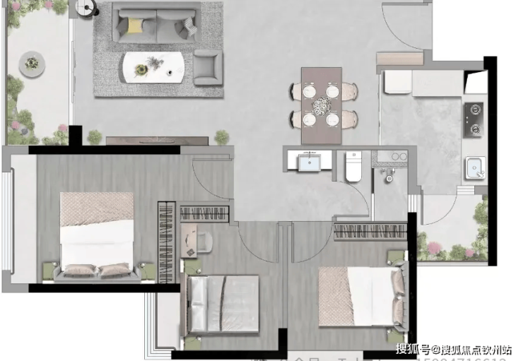 99㎡三+1房户型,约6.5米南向宽景阳台,环幕视野;