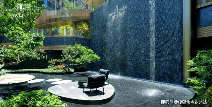 项目打造的近9米水庭院瀑布实景绽放。论形制、论规模,这处园林造景在前海乃至整个深圳都很罕见!
