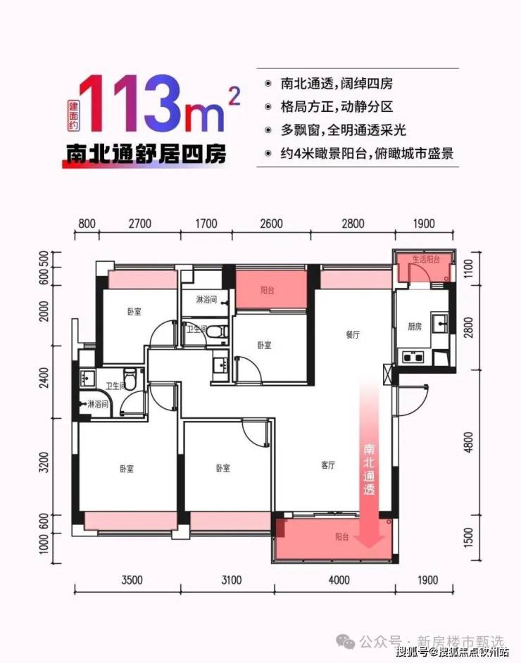 建筑面积约113-120㎡四房两厅两卫,稀缺南北通透,三阳台设计,约4米阔景大阳台。