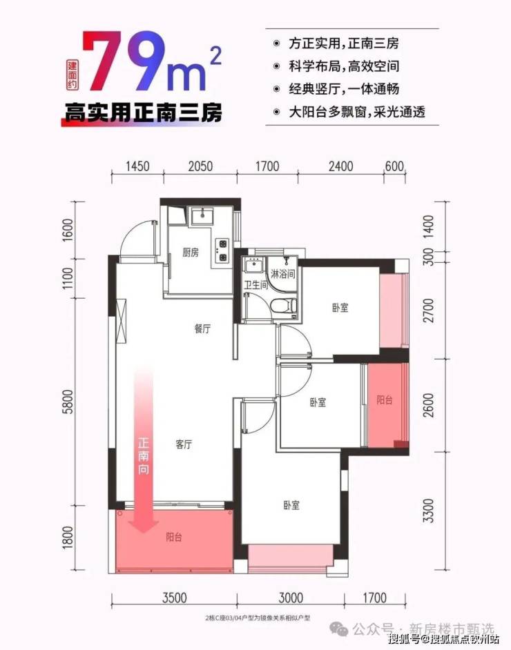 建筑面积约78-79㎡极致三房两厅一卫,稀缺高性价比三房