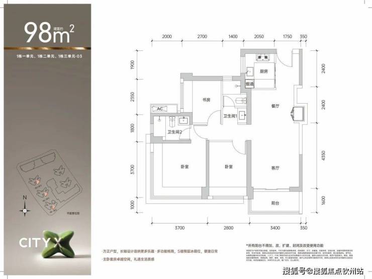 03户型:98平(东南向)单价39600-41100,总价389-404万。