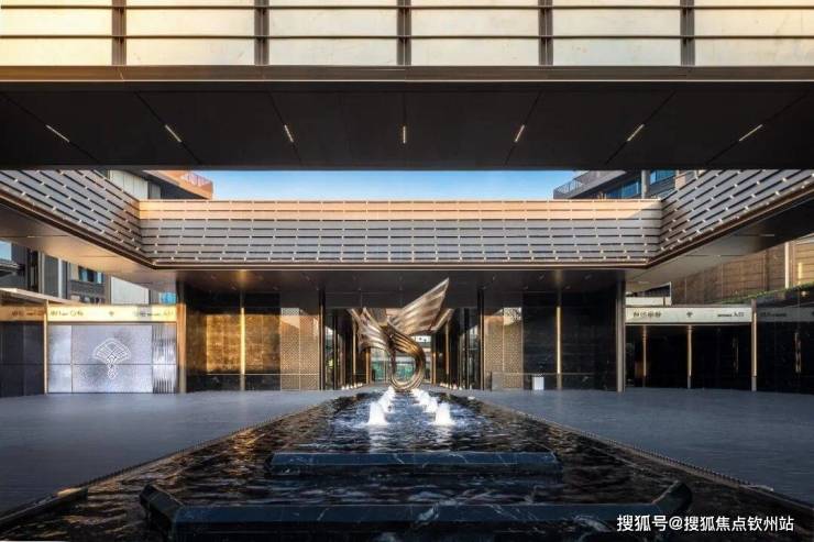 入口大堂仪式阵列感,层叠延展的线条欢迎访客到达,两侧种植池种植造型铁冬青,突出归家仪式感。