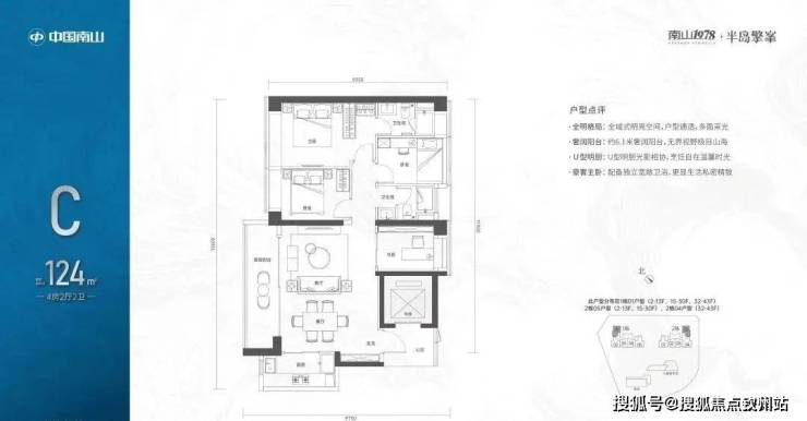 【124㎡的4房2厅2卫】1栋01/2栋05户型,电梯入户送独立公区,横厅南北通透格局,客餐厅6.1米开间,五开间朝南,主卧大套间设计,6.1米长观景大阳台,U型厨房,得房率:72.07%(不含赠送)西北或东南朝向;