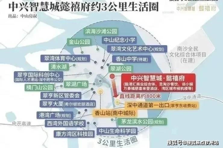 中兴智慧城懿禧府项目是离深中通道出口仅800米,是深中通道桥头堡项目,更是真正的地铁上盖物业,东瞰伶仃洋,西望翠湖公园,南北由茅龙河水域大面积覆盖,拥有海景、湖景、江景三面环绕的滨水景观和三面环公园的生态环境。中山未来最具人气的沙滩公园最近的唯一项目,更能近距离感受270米深中通道主塔地标性景观,以后世界打卡的地标,是你窗前的风景。更有世界级TOD香山站,让你的物业价值独领人才岛!