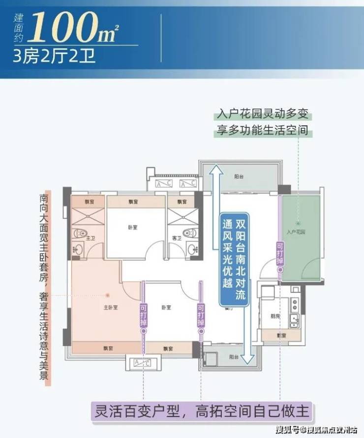建面约100㎡的三房,做到了四开间朝南、五开间瞰海。