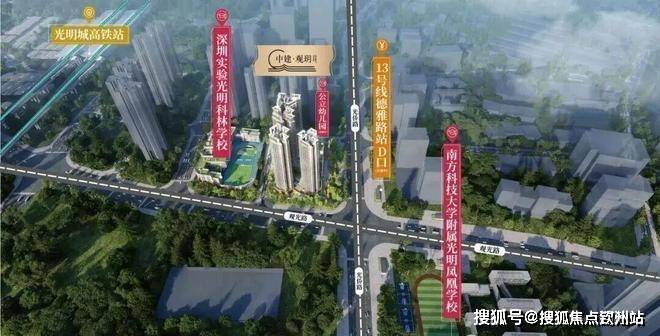 中建观玥名邸,位于光明区凤凰街道的住宅项目,紧邻光明科学城核心区与凤凰城板块,是高铁站板块最后一块住宅用地。项目周边有区政府、文化艺术中心等行政文化设施,2公里内覆盖蓝鲸世界、万达广场等商圈,享有15分钟生活圈便利。