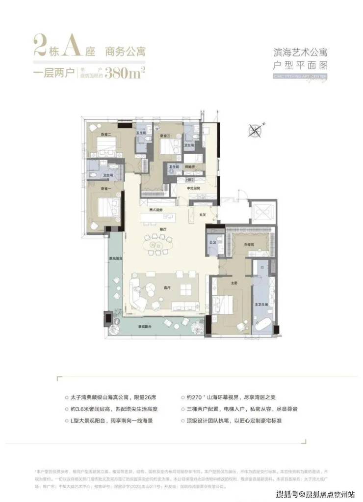 项目主打约380平方米的大平层,专梯入户,私密性极强。客厅设计有近9米的大开间,进深近10米,层高3.6米,净高约2.7-3.1米,空间感十足,尽显奢华品质。阳台设计为L型阳台,双面景观,大落地窗,采光无敌。主卧为东南向海景主卧,约4.2米开间,大尺度独立衣帽间及主卫,舒适感十足。