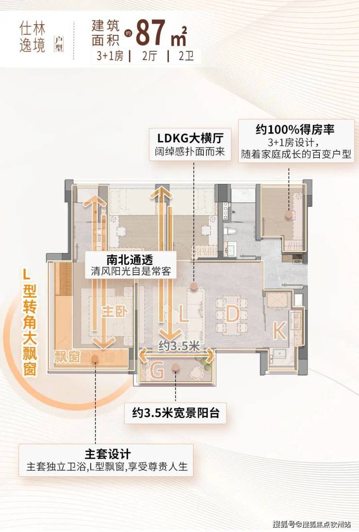 约3.5米南向景观阳台,加上LDKG一体化设计,横厅公区敞亮通透,更显空间阔绰感。