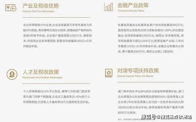 4. 全方面的优惠政策:加速促澳经济适度多元发展,从总部经济、产业培育、对澳专项扶持、金融产业、人才补贴五个方面对企业和人才进行奖励和扶持,如:企业进驻奖励、办公租金补贴、个人所得税奖励。