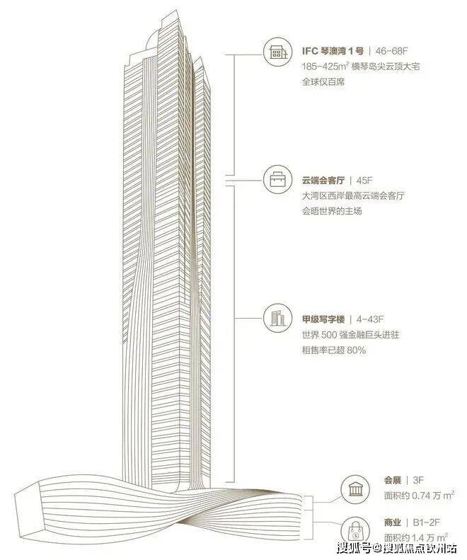 IFC横琴国际金融中心:建筑高度339米,是珠澳第一高楼。华发集团连袂凯达环球Aedas以“乘风驭势,蛟龙出海”为理念,寓意着新生力量磅礴跃起。占地面积约2.3万㎡,总建筑面积约20万㎡,集甲级写字楼、高端住宅、高端商业、会展中心、空中会所等多元高端业态,共69层,其中:
