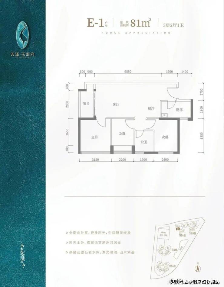 E1户型-80㎡-3房2厅1卫,2栋A座04户型,设计的是竖厅格局,客厅3.5米开间,餐客厅一体化,3个房间宽度分别为3.15/2.4/2.2米,除了厨房跟E2户型有点差异,其它格局都是一样的,得房率:84.3%(包含赠送),阳台进深1.5米,朝西南向。