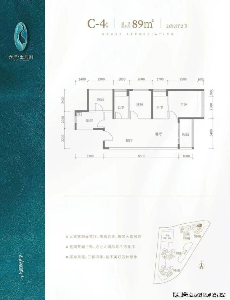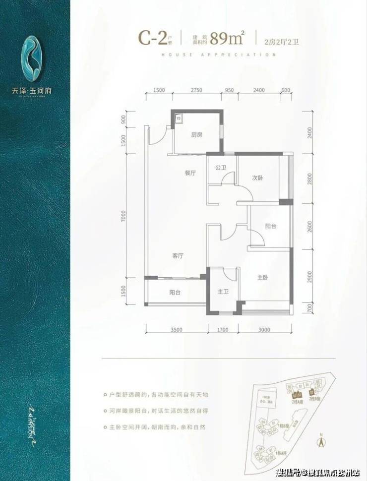 C2户型-89㎡-3房2厅2卫,设计的是竖厅格局,客厅3.5米开间,主卧及客厅阳台都朝南向。