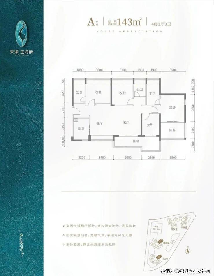 A户型-143㎡-4房2厅3卫,设计的是横厅南北通透格局,客餐厅开间7.3米,双主卧套房设计。4个房间宽度分别为3.6/3.5/3.1/2.6米,L型厨房,得房率:91.1%(包含赠送),超大观景阳台6.5米长,主朝东南朝向,看茅洲河景观。