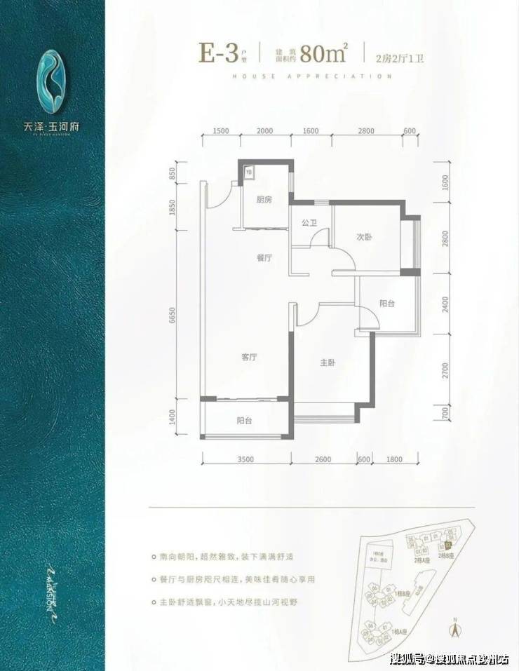 E2户型-80㎡-3房2厅1卫,设计的是竖厅格局,客厅3.5米开间,餐客厅一体化,阳台2.8米长,朝西向。