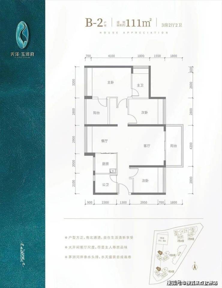 B2户型-111㎡-4房2厅2卫,设计的是竖厅南北通透格局,客厅4.2米开间,阳台主朝东北朝向,看花园景观,全屋飘窗设计。