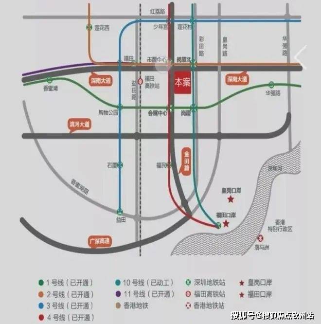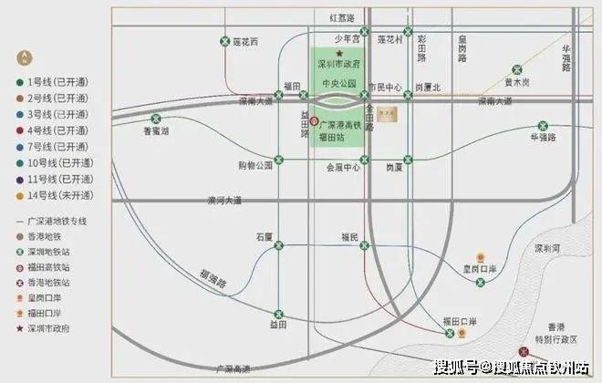 还有岗厦北交通枢纽(在建)、福田与皇岗双口岸,以及8条地铁线、近50个公交站点等。
