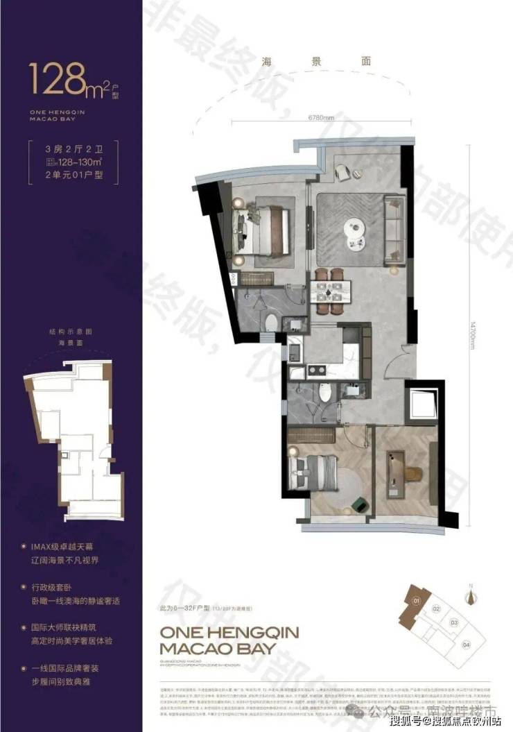 华发在金融岛内打造了鎏金海岸线天际物业——琴澳湾1号集群,位于金融岛岛尖,地理位置十分优越,不仅拥有约1.3KM的海岸线,还拥有独一无二的景观资源,东侧无遮挡眺望澳门城市景与海景,北侧看澳门本岛与澳门塔,纵揽两岸三地万亿海景,西、南两侧看金融岛内地标建筑。