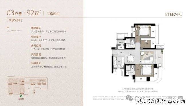 其中,项目最小面积92㎡产品,做到了双龙抱珠的户型设计,充分将户型内部空间进行展开,优化动静分区的同时,还实现了270°的小面积奢阔主卧景观。