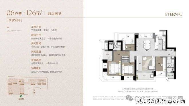 项目123㎡产品,实现了4房空间构造,同时还保证户型南北通透同时4个空间为南向开启,产品构造上通过凸窗延展了景观面,是市场上极少见的南向优质产品。