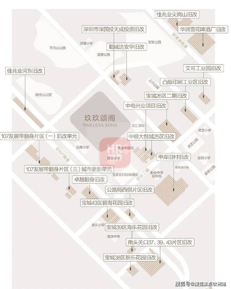 新安片区,尤其是在沿前进路正在进行着大规模的城市更新,分布着共20个旧改项目,超千万的旧改体量,相当于新安整个片区重建。仅我们项目2公里范围内就汇聚了8个旧改项目,分别是沃尔玛购物广场片区旧改、安华工业东区旧改,卓越翻身旧改、宝城碧海花园旧改、公路局西侧旧改、甲岸村旧改、宏发新领域、中洲中央公园二期。