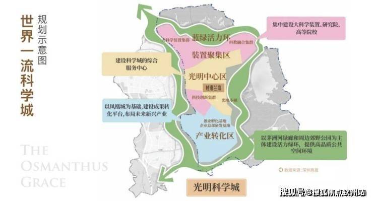 光明布局规划“一心两区”,“一心”即光明中心区,建设科学城的生活服务中心,集聚商业、居住、大型公共服务设施等顶级配套。
