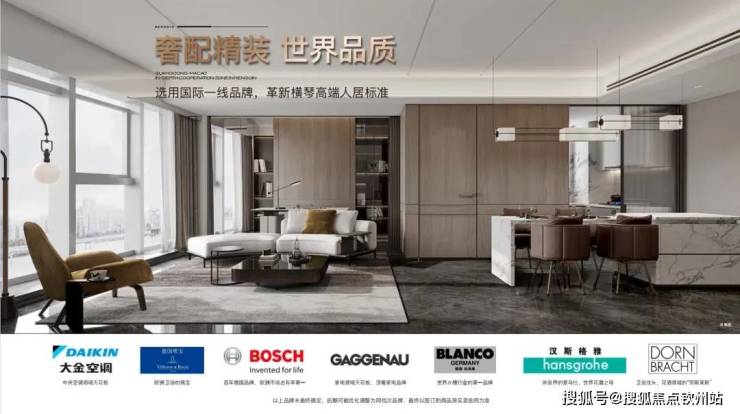 交付标准:精装,选用国际一线品牌如大金、博世、嘉格纳、美诺、当代、铂浪高、汉斯格雅等