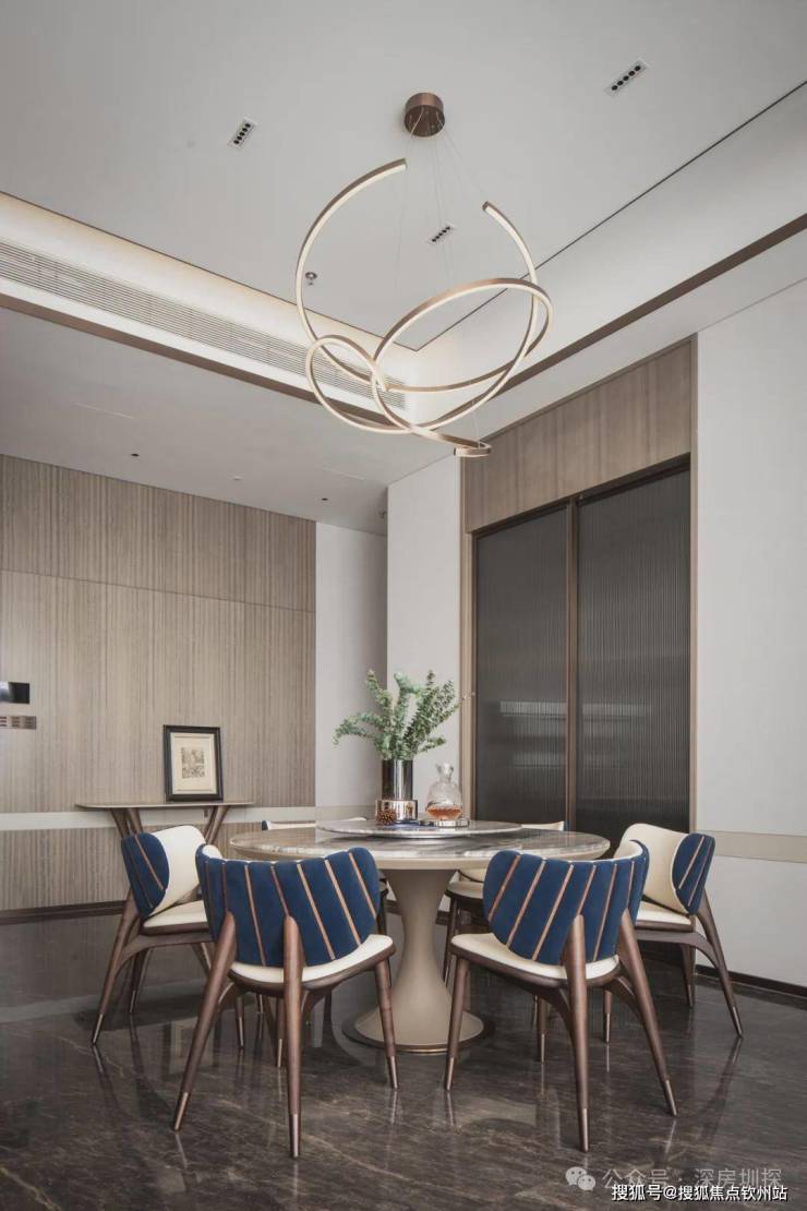 古铜不锈钢的坚硬,撞上大理石凝固的艺术内涵,交融出高雅质感。多样材质丰富空间层次,以简约之形精妙结合。清亮光泽在与木饰面交接处悄然隐没,生动韵味于其间自在流转,营造和谐自然的艺术氛围。